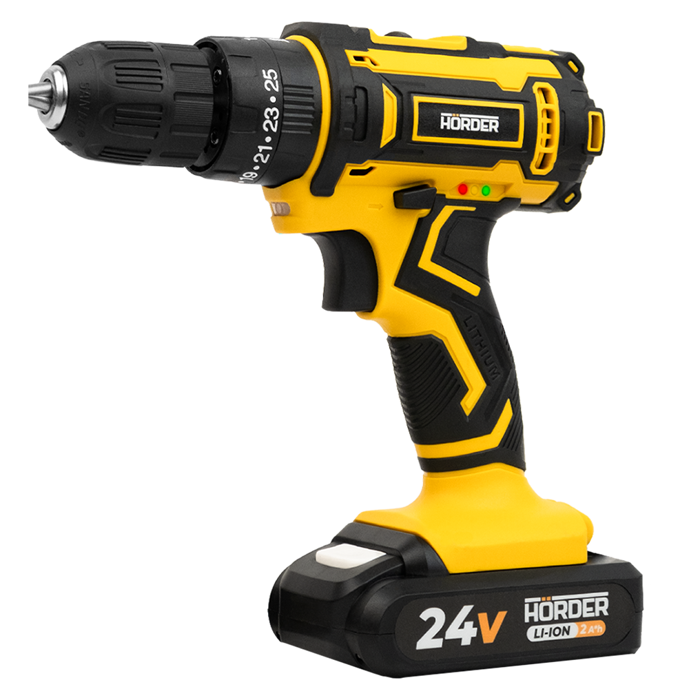 Акккумуляторная дрель шуруповерт HORDER HC-24Li2 - это надежный и долговечный вариант для бытовых и профессиональных работ. Электрошуруповерт на аккумуляторе обладает повышенной мобильностью. В набор входят 2 Li ion аккумулятора на 24В, срок службы которых составляет рекордное количество циклов зарядки - до 3000, в отличии от свинцово-кислотных, где всего 1000-1500 циклов. Аккумуляторы не требуют какого-либо обслуживания в течение всего срока эксплуатации. Мощный щеточный электрический двигатель работает в 2 режимах со скоростью вращения 650-1650 об/мин.
